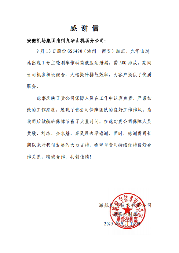 9月14日,池州机场机务工程部收获天津航空公司感谢信一封,感谢部门提供的人员及设备支持,协助完成飞机轮胎和刹车组件的排故更换工作,大幅提升了排故效率。9月13日,天津航空公司GS6490在池州机场落地后,检查发现1号主轮刹车作动筒存在液压油泄露情况,部门当班队长......