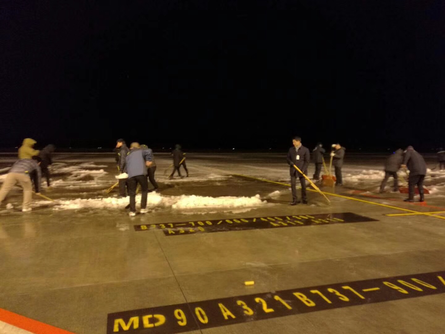 自1月24日起,池州地区迎来了入冬以来的第一场雨雪天气,25日上午受持续降雪与跑道结冰影响,机场已无法正常运行。为切实做好强降雪天气应对工作,保障机场安全,各部门严阵以待,第一时间部署值班、巡查和应急处置力量,多措并举全力应对雨雪天气,启动大面积航班延误(备降)处置预案与除冰雪应急预案,一方面分公司领导带领各部门保障人员从凌晨开始,利用吹雪车、人力铲雪等方式对跑道、滑行道、停机坪的积雪、结冰进行清除;另一方面与各航空公司及时沟通联系,适时公布航班动态信息,加派人手到候机楼大厅现场巡视,全力做好旅客服务工作,协助旅客办理客票退改签、交通、食宿等延伸服务工作,并通过当地主流媒体、微信、网络等方式,提请广大旅客及时了解机场航班动态,合理安排出行选择。在这场对抗大雪的应急处置中,九华山机场全体员工均参与其中,在凛冽的寒风中与冰雪持续对抗作业,斗志昂扬地为保障航班正常奋战。